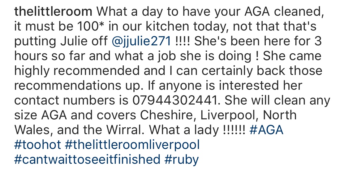 What an amazing job JULIE did with my 25 year old Aga. Her hard work, knowledge and attention to detail left me feeling very impressed. She replaced the dirty and low insulation around the plates and even touched up a couple of chips I had on the top. I would definitely recommend this personable lady.